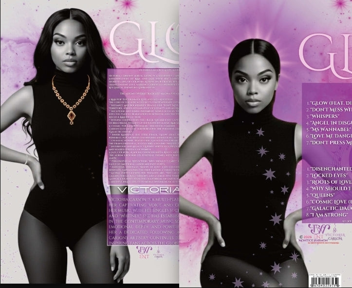 Victoria Carson's album, Glow, is a masterful tapestry of sound and spirit, weaving together the intimate introspection of R&B and Jazz with the confident swagger of Pop and Hip Hop, and the grounded storytelling of Country. Across its 18 tracks, the album explores themes of divine femininity, resilience, and transcendent love, marking Carson as a powerful new voice in contemporary music.