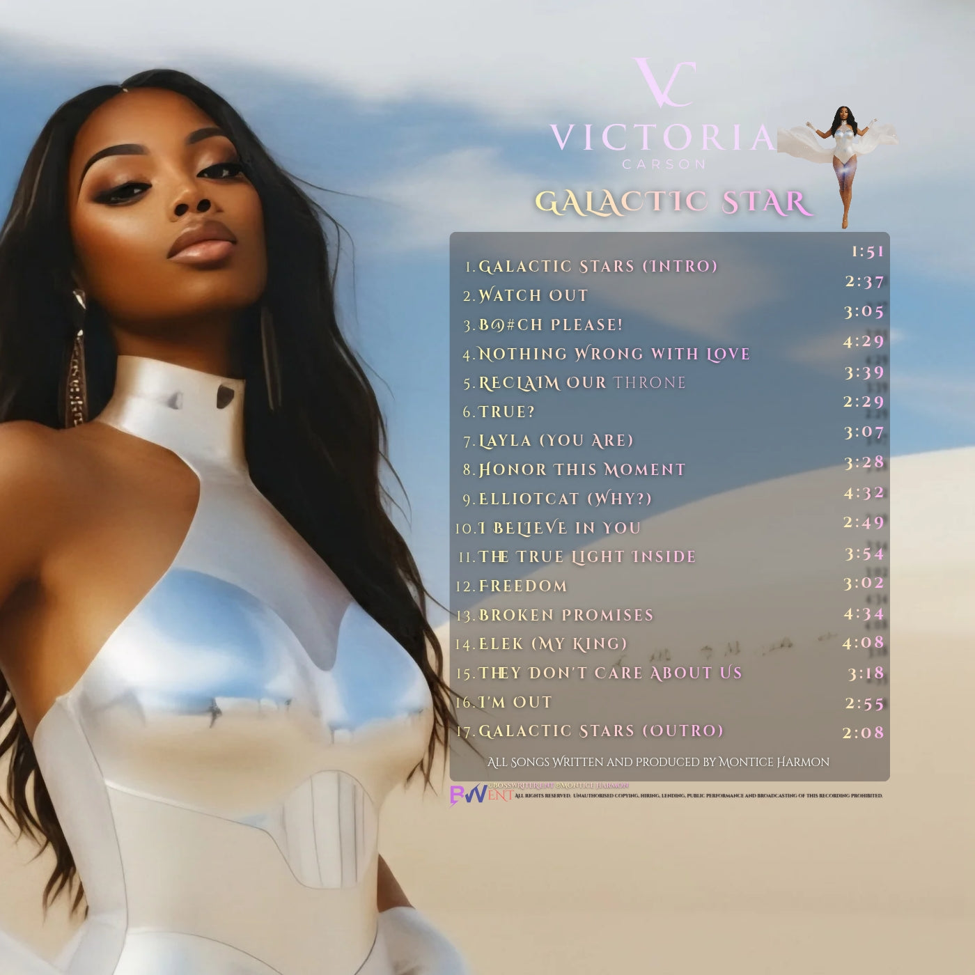 The emotionally charged **They Don't Care About Us** confronts social injustices, echoing a call for change, followed by the liberating anthem **I'm Out**, symbolizing a decisive break from negativity and oppression. Concluding with **Galactic Stars (Outro)**, the album brings listeners full circle, reminding them that the journey doesn’t end; it evolves. **Galactic Star** is not just an album; it’s a powerful statement of strength and perseverance, showcasing Victoria Carson as an artist unafraid to explore the complexities of life and love.